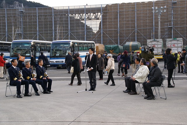 また日南市長の歓迎挨拶・にちなんぢゃさまとRAIDENの子供たちから船長さんたちに花束が贈られました