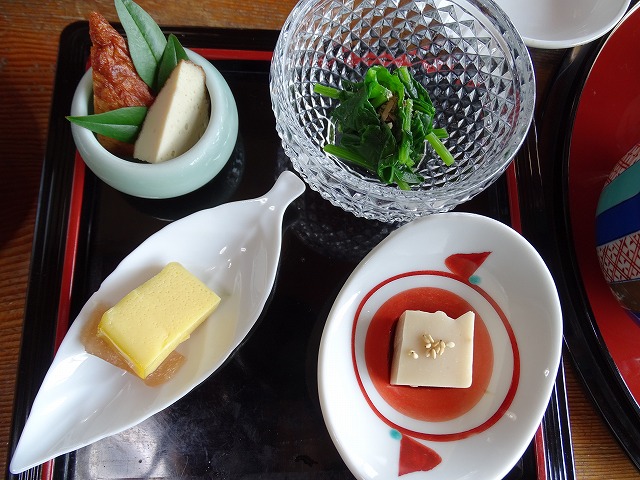 • ピイナッツとうふ・ほうれん草のおひたし・厚焼たまごとむかでのり・飫肥天