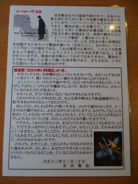 宮沢賢治はその童話や詩の中で、自身の心象を表すために多くの言葉や擬音を造り出しています。「イーハ・トーヴ」もその中の一つであり、賢治が造った言葉です。1924年(大正13年)に賢治が自費出版した童話集『注文の多い料理店』は、表紙の題名の上に”イーハトヴ童話”と書かれています。「イーハトーヴ」とは『注文の多い料理店』を出版するにあたって賢治が書いた「広告ちらし」文の中に、「イーハトヴは一つの地名である。これは著者の心象中に、このような状景をもって実在したドリームランドとしての日本岩手県である。」と書かれていますが、現実の岩手県というわけではありません。賢治がこうであって欲しいと思って描いた岩手県であり、またそれは、いろいろな国のいろいろな地方なのです。