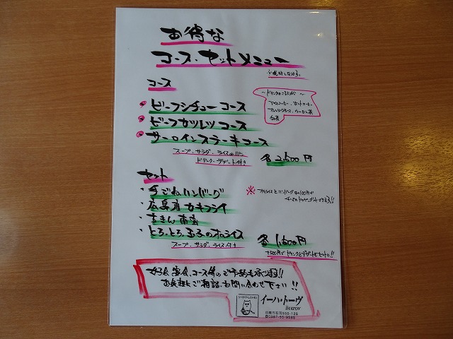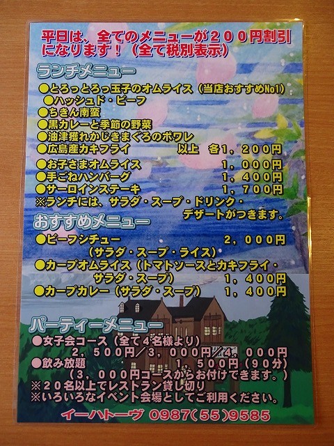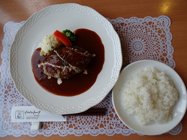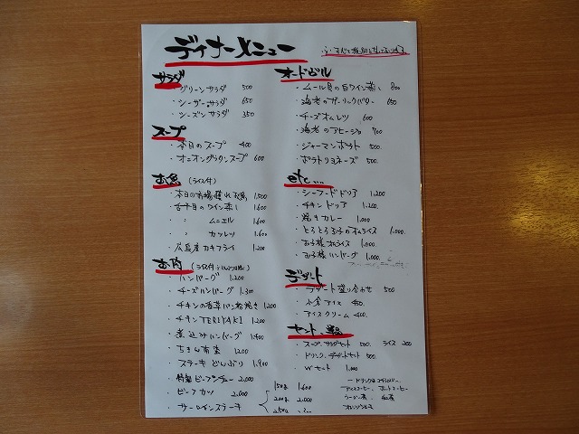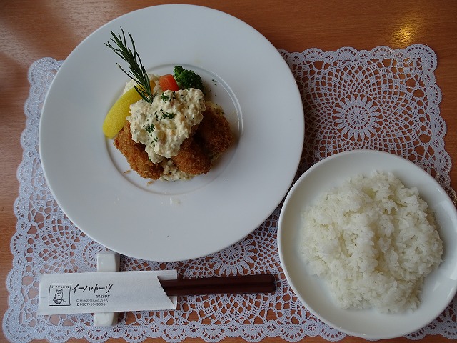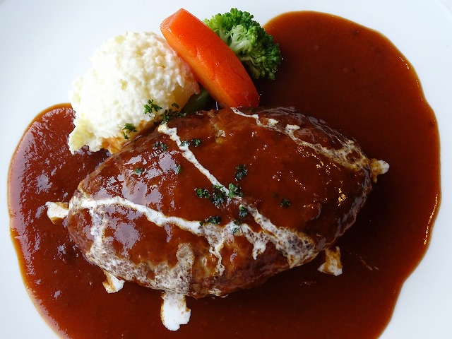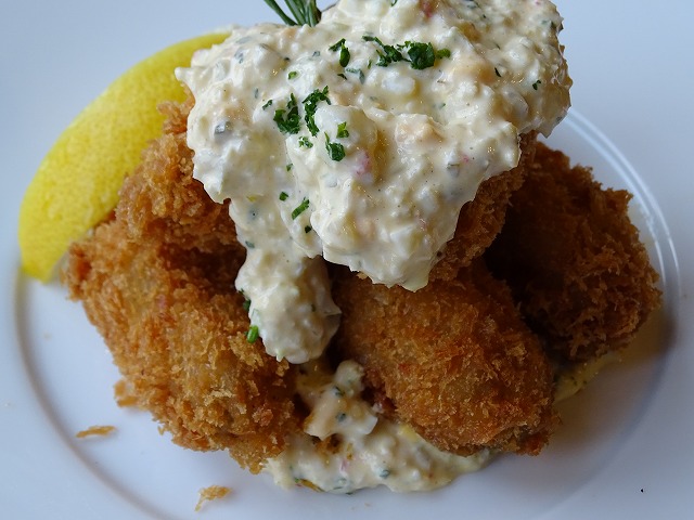 今日食べた料理は手ごねハンバーグ・セット1500円(税別)と広島産カキフライセット1500円(税別)別に単品としてドリンクとデザートのセット+500円・シェフの話で日南ではここしかないハイネケン樽詰生+500円でした。セットメニューはスープ(かぼちゃ)・シーザーサラダ・ライス付きです。デザートは盛り合わせで抹茶のシホンケーキ・串間産の大束芋のキントン・北海道の小倉・グレープフルーツ・イチゴ・オレンジに生クリームでした。大変美味しい料理でした。カキ大好きで~す。