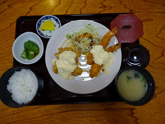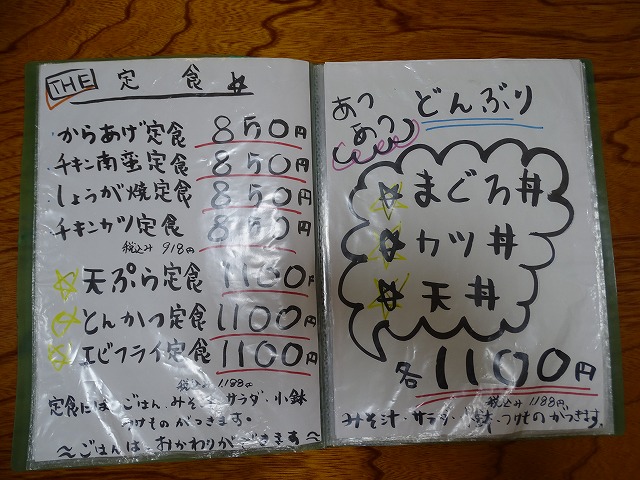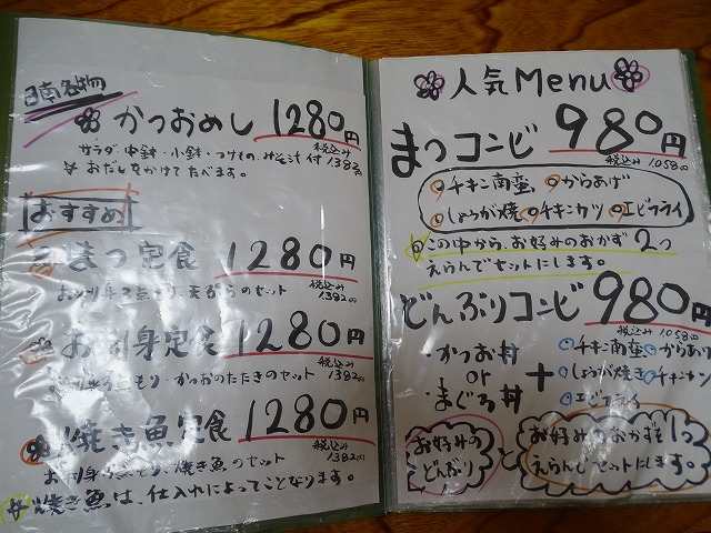 今日2人行って来ました。料理はまつ定食・お刺身3点もりと天ぷらセット(税込1382円)とまつコンビ・チキン南蛮とエビフライのセット(税込1058円)まつコンビはチキン南蛮・からあげ・しょうが焼・チキンカツ・エビフライのこの中からお好みおかず2つえらんでセットにした料理です。