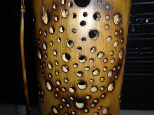 全面は円形模様・背面がダイヤ模様で創られています。大きさは土台が5㎝竹灯ろうが63㎝・直径が13㎝です