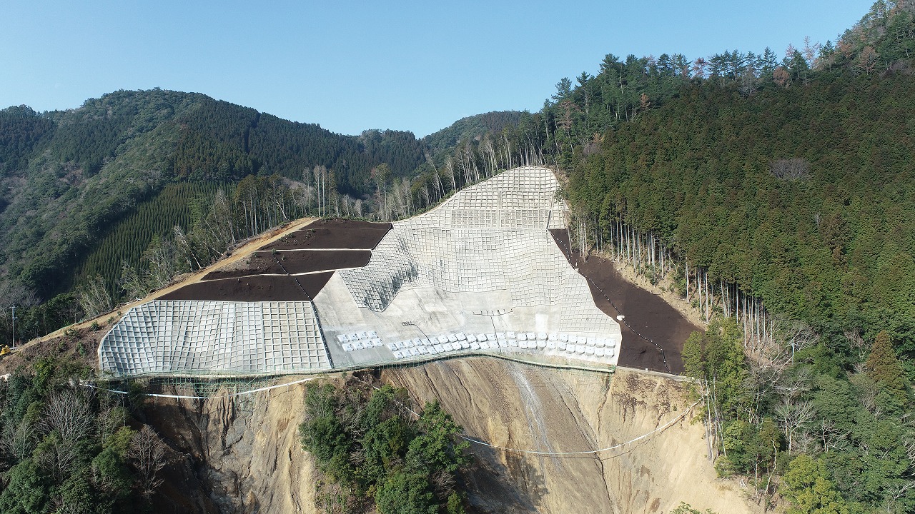 伐採から、機械による法面掘削・法面整形(土工事・構造物)及び法面保護工事の一連作業
